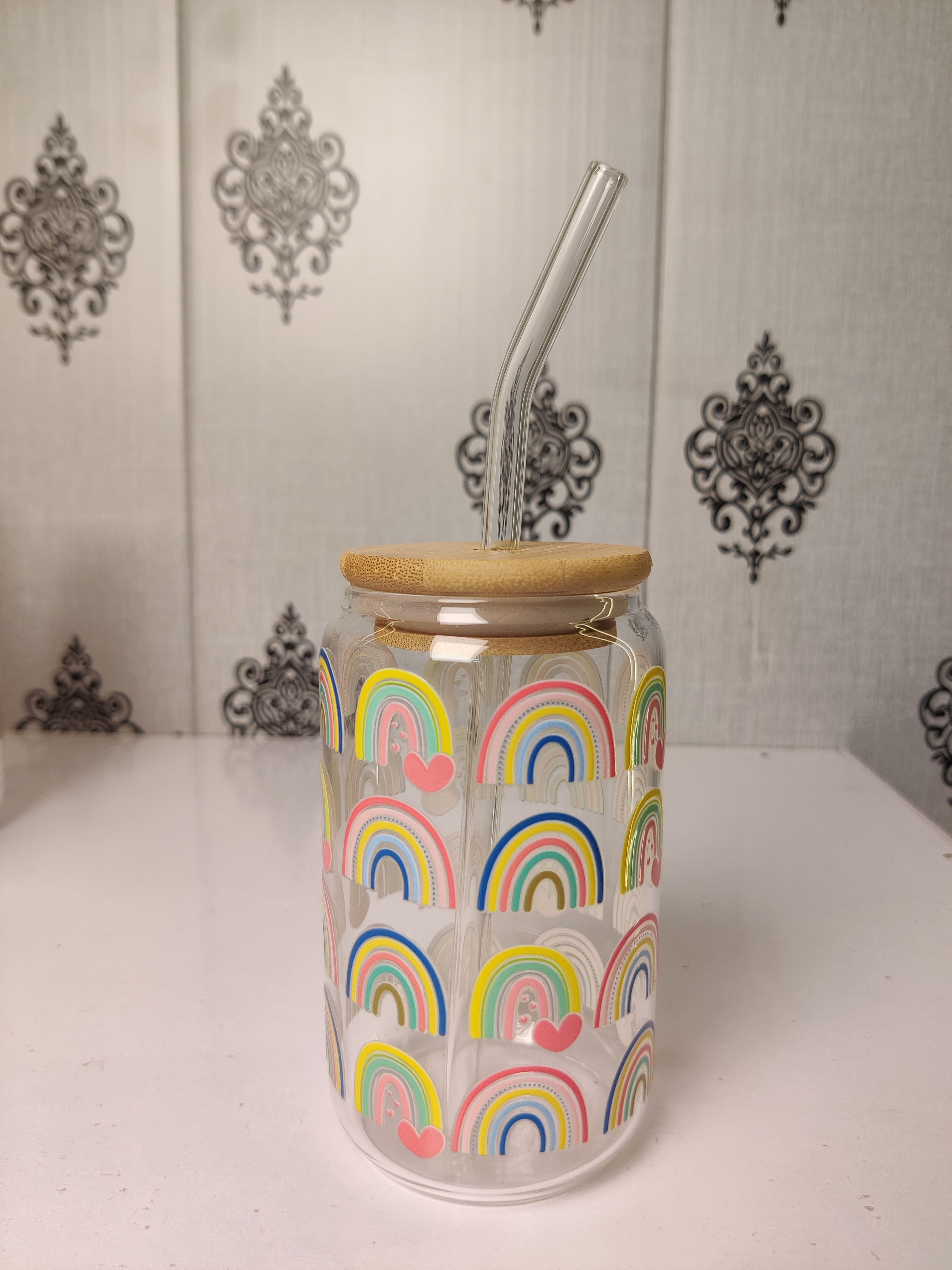 The Rainbow Within cup holds 16 ounces or 24 ounces of your favorite beverage, includes a bamboo lid and glass straw, along with a straw cleaning brush. This cute glass cup is the perfect way to enjoy your favorite beverage without sacrificing on your style. Its modern and compact design makes it a great choice for on-the-go. The design is placed onto the glass using a high-quality UVDTF transfer, making it permanent, almost texture-free, waterproof, and it's designed to withstand daily use and washing, making it an ideal choice for everyday use.